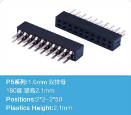 P5系列:1.0mm 单排母 180度 塑高2.1mmP5系列:1.0mm 双排母 180度 塑高2.1mm